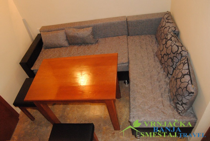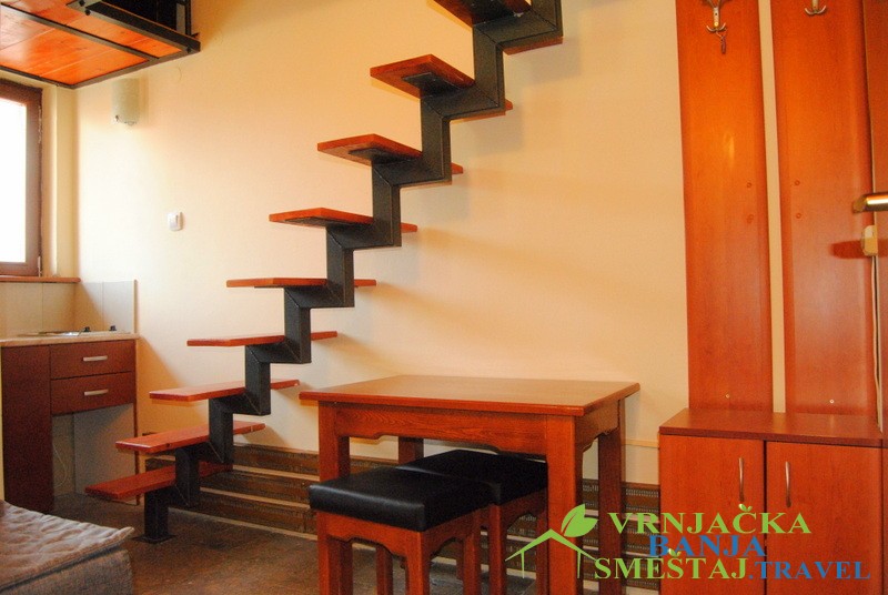 Apartman je u dva nivoa. U prizemlju od 12 kvadrata se nalazi garnitura na rasklapanje, mini kuhinja i kupatilo. U potkrovlju apartmana od 9 kvadrata se nalazi komoda i francuski ležaj.