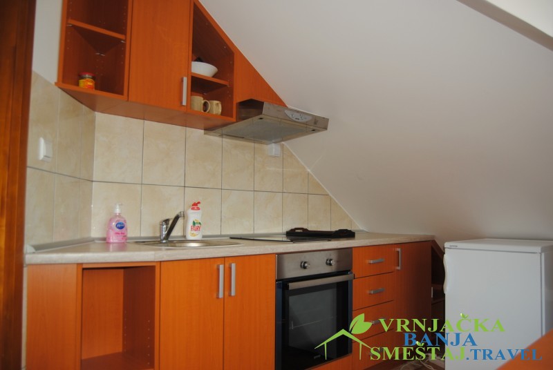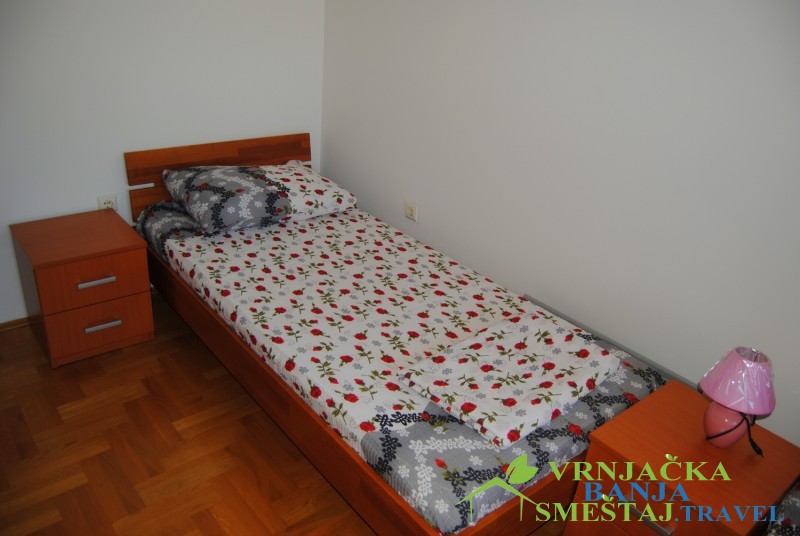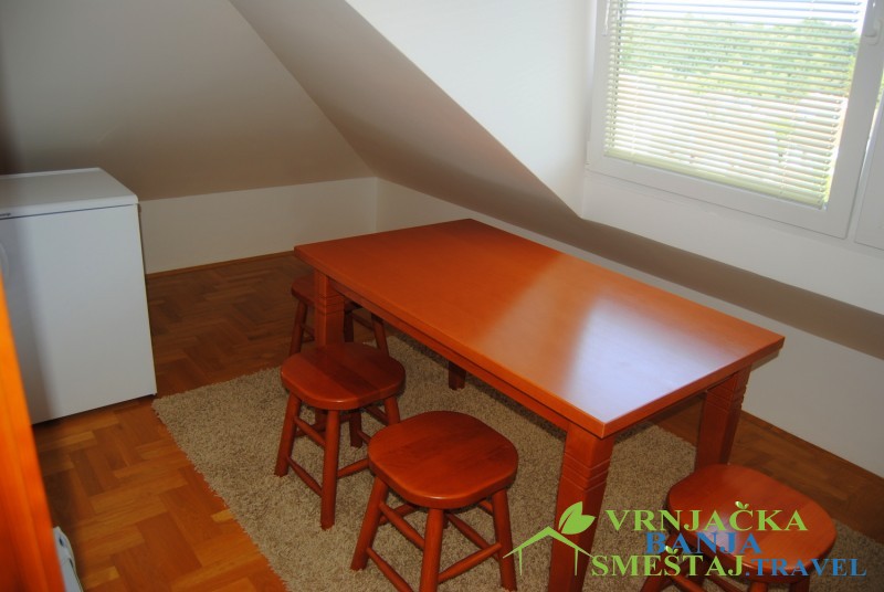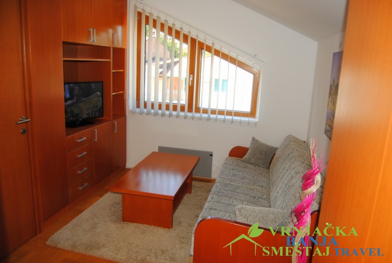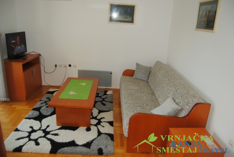 Prvi apartman ima dnevni boravak (ležaj na razvlačenje), terasu sa pogledom na planinu Goč, kuhinju sa trpezarijom, spavaću sobu sa francuskim ležajm, kupatilo i hodnik. Opremljen je kablovskom, WiFi-em, klimom i norveškim radijatorima.